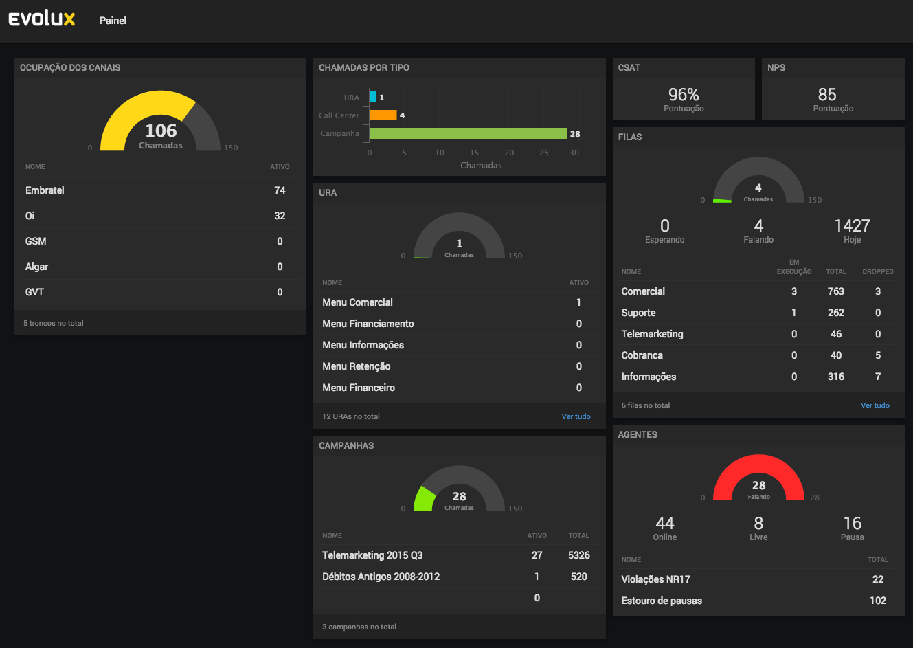 O Evolux possui uma interface intuitiva, com recursos como distribuição de chamadas multi-skill, URA, monitoria de qualidade, gravação de chamadas, supervisão da operação, relatórios e dashboards em tempo real.